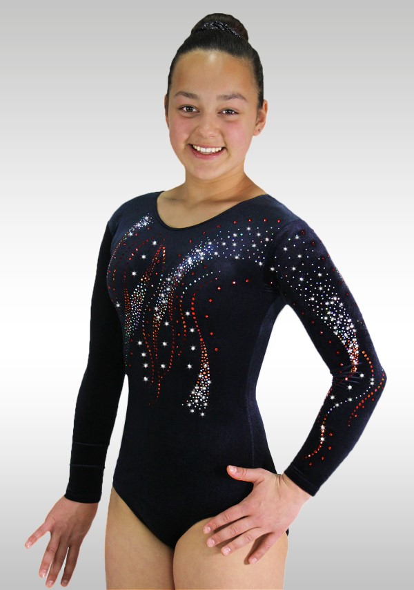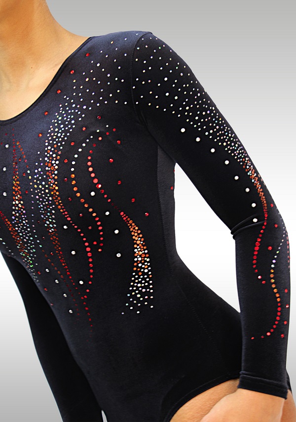 Turnpakje in zwart glad velours met een heel mooi opvallend patroon van rode /zilveren glitters.