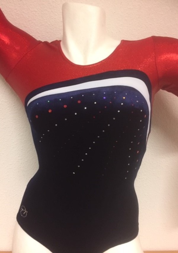 Turnpakje VR-8018 Marineblauw velours turnpakje met rode hologramstof rond de nek en op een mouw. Glitters voor en achter ! Het turnpakje is verpakt met een bijpassende rode wokkel. Voor een bijpassend turnbroekje, bestel een broekje beginnend met de letter K.